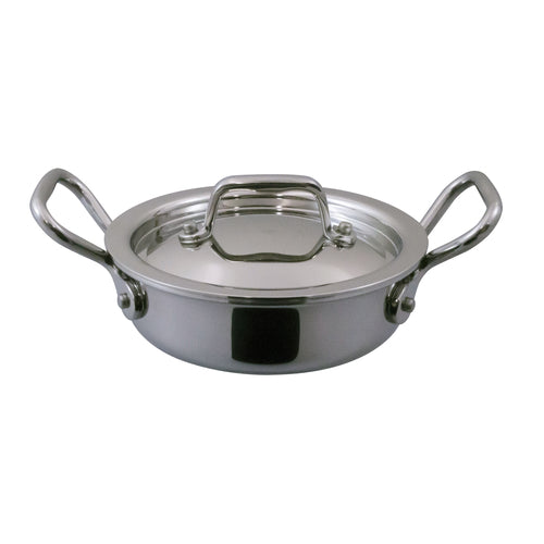 Mini Rondeau Pan, low, 8 oz., 4" dia. x 1-1/4"H, without lid, induction ready, riveted handles, dishwasher safe, tri-ply stainless steel & aluminum, mirror polished finish, Paderno, Mini S/S Cookware