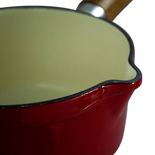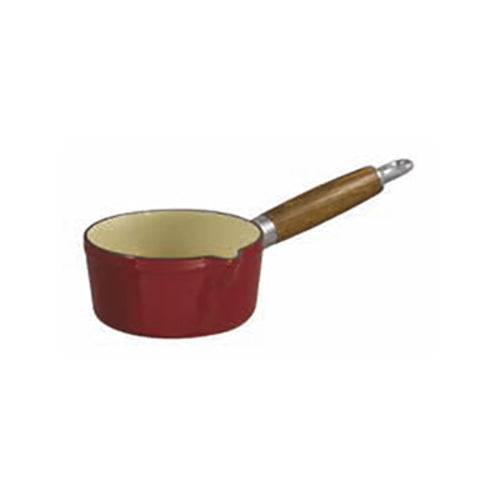 Milk Pan, 3/4 qt., 5-1/2" dia. x 2-3/4"H, spout on lip, twice enameled cast iron construction, stay cool wooden handle, red, Paderno, Chasseur (Special Order Item)