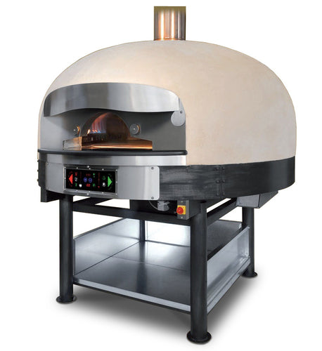 Morello Forni Rotary Wood/Gas Combo Fired Pizza Oven, hybrid (operates gas only, wood only, or combination wood & gas), 51" inside cooking diameter, rotating cooking deck, touch screen electronic control system, (23) 8", (12-14) 10", (10) 12", (5-6) 16" pizza capacity, 7” thick sealed insulated walls, dual burners system (internal dome burner & under deck, emergency stop button, high refractory premium grade alumina with heavy metal enclosure, basic cupola, 220v/60/1-ph, 136,000 BTU, NSF, UL