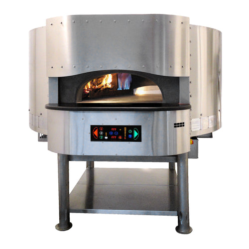 Morello Forni Rotary Wood/Gas Combo Fired Pizza Oven, hybrid (operates gas only, wood only, or combination wood & gas), 51" inside cooking diameter, rotating cooking deck, touch screen electronic control system, (23) 8", (12-14) 10", (10) 12", (5-6) 16" pizza capacity, 7” thick sealed insulated walls, dual burners system (internal dome burner & under deck, emergency stop button, high refractory premium grade alumina with heavy metal enclosure, stainless steel finish, 220v/60/1-ph, 136,000 BTU, NSF, UL