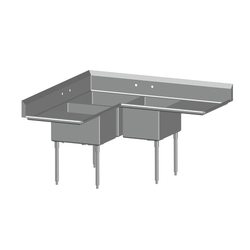 Universal Stainless Corner Sink, three compartment, 24" left & right-hand drainboards, (2)24" front-to-back x 18" wide comp. and (1)24" x 24" comp., 12" deep, with 9" high splash, galvanized legs, 16/300 series stainless steel, NSF, CSA