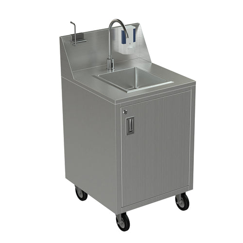 Mobile Hand Wash Station, 24"W x 25 1/4"D x 47-3/4"H overall size, 9 1/2" backsplash, (1) 12"W x 14" front-to-back x 6" deep bowl, 1.5" drain basket, deck mounted 8" automatic sensing faucet, cabinet body, hinged door with lock, key, & recessed handle, splash-mounted soap dispenser and roll paper towel dispenser, (1) removable 5-gallon fresh cold water tank with 37" hose, (1) removable 7.5-gallon waste water tank with 37" hose, 2-gallon water heater tank and pump, 5" plate casters (2 with brakes), 120v, cNSFus