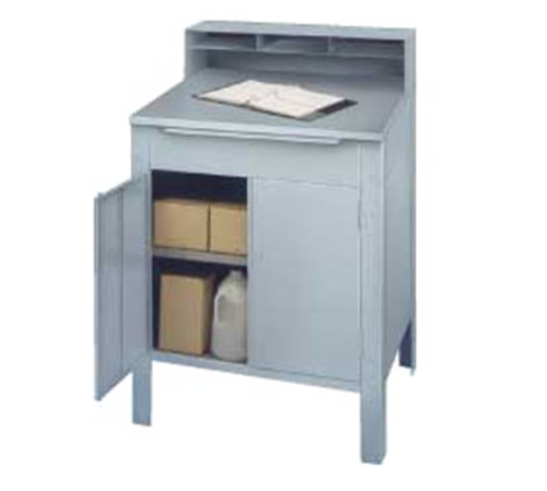 Desk, Receiving, stand up design, sloped top writing surface, with lockable drawer below, enclosed cabinet base with double doors with lock, enamel heavy-gauge steel construction