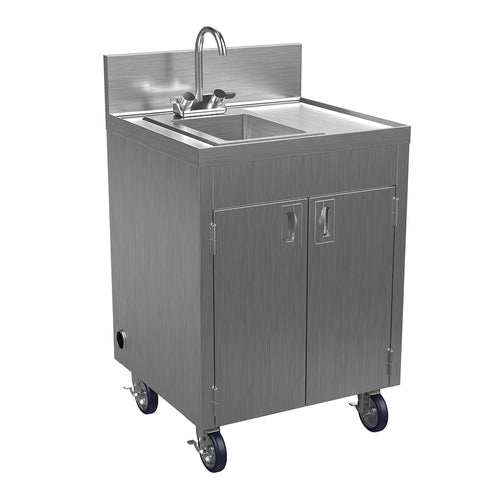 Hand Sink, mobile, 1-compartment, 10" x 14" x 5" deep bowl, 6" goose neck faucet, basket drain, 6" boxed backsplash, 5 gallon clean water & 6 gallon waste containers, Stiebel Eltron Mini water heater, Shurflo water pump, 16 gauge stainless steel top, 18 gauge stainless steel cabinet, (4) 5" swivel polyurethane casters with brakes, 120v, 20.0 amps, cord, NSF