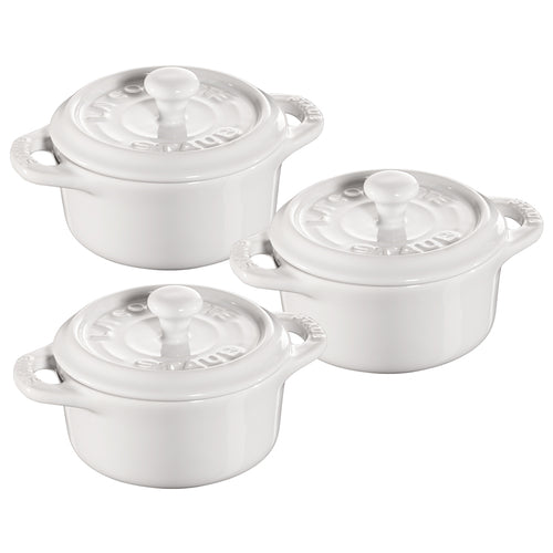 Staub® Mini Cocotte, 8 oz., 4" dia., 5.4" x 4" x 2.6" O.A., round, with lid & handles, scratch, impact and thermal shock resistant, dishwasher, broiler, microwave, freezer and oven safe, up to 572°F, ceramic, white (set of 3) (2 set minimum order) (Special Promo NET Price (contact factory for price)