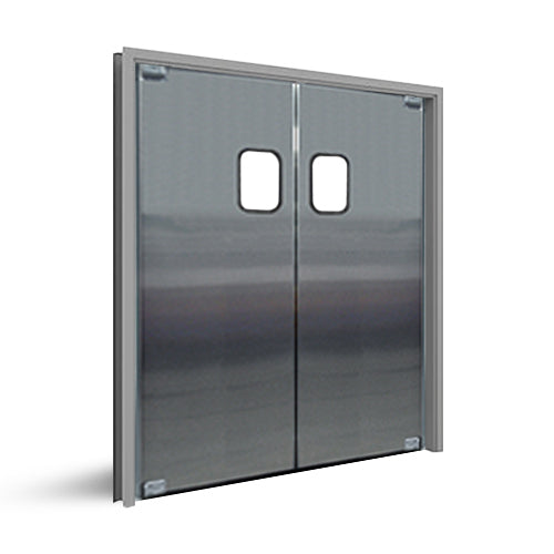 DSP 3 Stainless Steel Door, PAIR, 56"W x 96"H, 16 gauge stainless steel with #4 brushed finish, full length back spine, XL Ultra Soft touch hinge (standard), 9" x 14" clear acrylic window set in black rubber molding