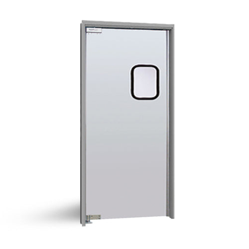 LWP 3 - Lightweight Aluminum Traffic Door, single panel, 32"W x 84"H, .063 inch anodized aluminum, diamond formed leading edge, 9" x 14" clear acrylic window set in black rubber molding