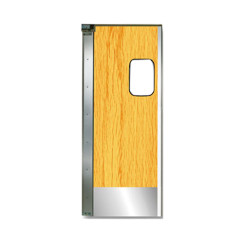 LWP 6 - Lightweight Aluminum Traffic Door with HPL, single panel, 40"W x 96"H, constructed with .063 inch anodized aluminum, .032 decorative high pressure laminate finish on both sides, leading & back edge is triangular formed for vertical panel stiffness and durability, 9" x 14" clear acrylic window set in black rubber molding, 12" stainless steel kickplate