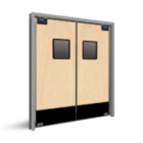 SCP12 - Kitchen Classic - Restaurant Standard Service Door, PAIR, 72"W x 84"H, 3/4" wood core, .032 high pressure laminate both sides, 8" high black ABS kickplate both sides, 9" x 14" clear acrylic window flush window frame