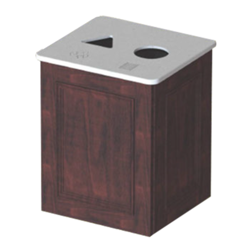 Recycle/Waste Station, 28"W x 26"D x 35"H, accommodates & includes (2) rectangular poly waste receptacles (refuse/recycle), solid resin top chutes (embedded symbols), front doors with hidden hinges, finished interior, wood veneer construction with decorative panel, choice of cabinet finish & resin top finish, Made in USA (contact factory for price)