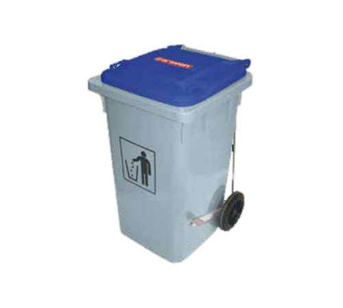 Araven Mobile Rubbish Bin, 26 gallon,19-1/4"W x 20-1/2"D x 31-1/2"H, square, ergonomic handle, blue hinged lid, large wheels, rubber tires, foot opening pedal, high-density polyethylene, gray