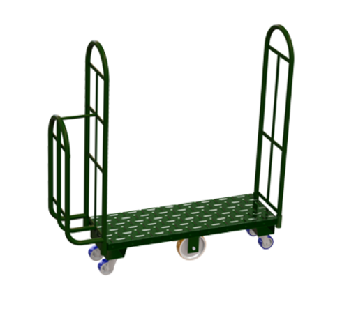 U-Boat Cart, 48" x 16", 14 gauge steel deck, with cardboard storage slot, removable handles, (4) 4" poly-U swivel plate outer casters and (2) 8" poly-U flat tread center wheels, heavy duty steel construction, green powder coat finish
