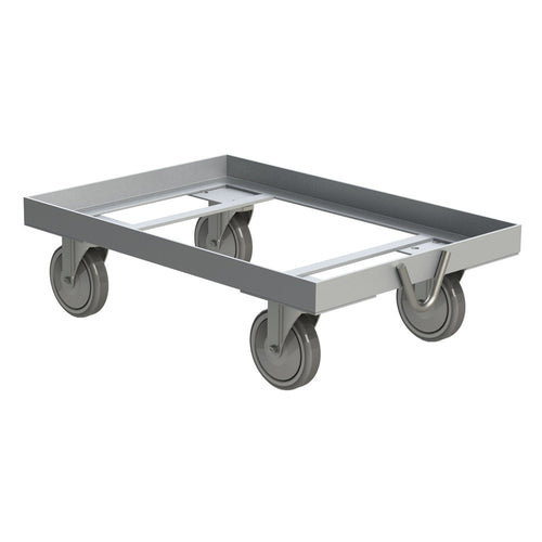 Stack-N-Nest Tote Dolly, Angular Frame, 29"W x 19"D x 8"H, 1-1/2 x 1-1/2" x 3/16" thick aluminum angle, (4) 5" poly-U plate casters, aluminum construction, NSF, Made in USA