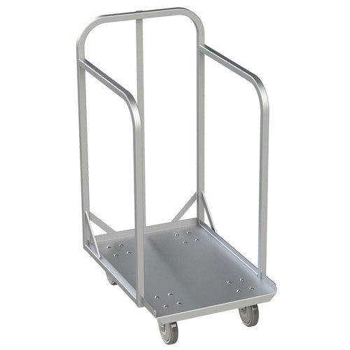 Cafeteria Tray Dolly, single stack, for 20" x 15" Cafeteria trays, Solid base, with push handle, (4) 5" poly-U plate casters, aluminum construction, NSF, Made in USA