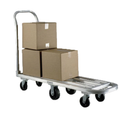 Low Boy Stock Platform Truck, 39"W x 14"D x 7-3/4"H, (40"H with handle), removable handle, rounded front, 1000 lbs. capacity, welded aluminum construction, casters (2) 5" swivel & (2) 5" rigid, NSF, Made in USA