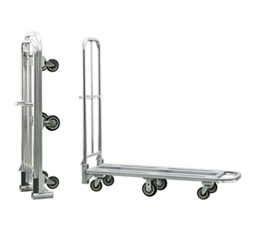 Folding Stock "L" Cart, 18"W x 63"H x 65-3/4"L (15-1/2" x 64-1/2" x 18" folded), portable, push handle with lock, 1200 lbs. capacity, extruded aluminum tube welded into rectangular frame, 5" radius corners, polyurethane tread on polyolephin core with zinc plated steel rigs caster (4) 5" swivel & (2) 6" x 2" rigid, Made in USA