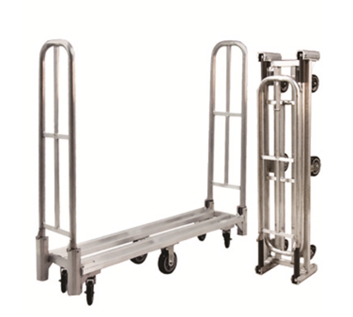 Folding Utility Cart, 64-3/4"Wx 16"D x 64"H (unfolded), single platform, 1-1/2" tube construction, handles latch in place, (4) 5" x 1-1/4" (C453) & (2) 6" x 2" (C518) polyurethane, platform swivel casters, 1500 lb. capacity, Made in USA