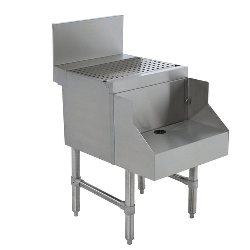 Prestige Blender Station, 18"W x 30"D x 36"H, 7" backsplash, removable perforated drainboard work top with 1" drain, recessed blender shelf with grommet hole, rear deck for extra storage, 15 amp 120v duplex GFI receptacle hidden beneath shelf, stainless steel top, apron, sides & legs with adjustable stainless steel bullet feet, NSF