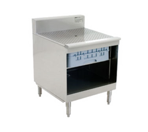 1800 Series Underbar Glass Rack Storage Unit, recessed workboard top, 18"W x 20"D x 33-7/16"H, 304 stainless steel construction, open front cabinet base, 3-1/2"H backsplash, bullnose front edge, top includes removable stainless steel perforated insert & 1-1/2" stainless steel drain, 1-1/2" I.P.S. stainless steel drain in bottom shelf, galvanized legs with adjustable plastic bullet feet, NSF