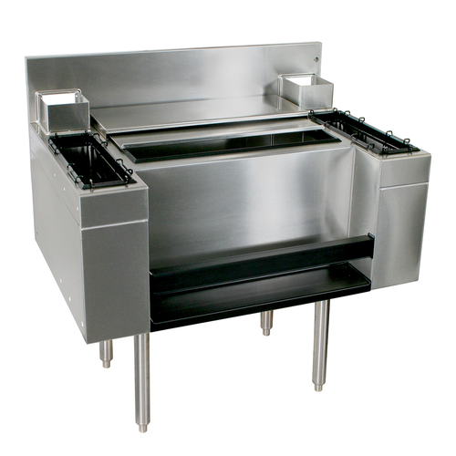 Underbar Ice Bin/Cocktail Unit, Casino Style, with bottle well storage, 36"W x 19"D, built-in 10-circuit cold plate, 67 lbs. ice capacity, 10-1/2" deep bin liner, ABS plastic breaker strip around ice bin liner, includes stainless steel sliding covers, (2) 3-bottle insulated storage compartments - left & right of main ice bin, 24" single speed rail, stainless steel cover, includes (2) wire bottle racks, stainless steel construction, stainless steel legs with adjustable bullet feet, ETL-Sanitation