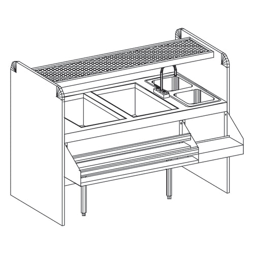 Assembly Ice Bin/Cocktail Station, pass-thru combo, 60"W x 32"D, counterclockwise configuration, (2) pass-thru ice bins, tubing chase, (2) wet waste sinks with (1) gooseneck faucet (low lead compliant) & strainers, blender shelf, double speed rail, 15"D stainless steel draining shelf with removable perforated inserts, laminated wooden front & end panels, ETL-Sanitation