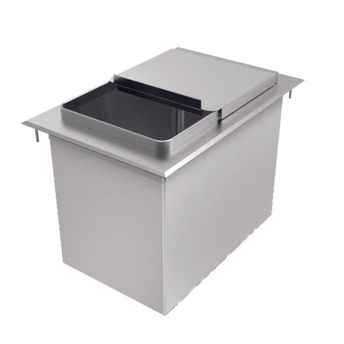 Ice Bin, drop-in, 62 lbs. ice capacity, 28"W x 18"D x 14"H overall size (bin size 25"W x 14"D x 11-3/4"H), sliding cover, insulated, 1" dia. center drain, stainless steel construction, ETL