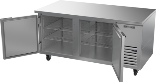 Undercounter Side-Mount Freezer, two-section, 67"W, 20.08 cu. ft., electronic control, (2) hinged self-closing solid doors, (4) wire shelves, stainless steel exterior top, front, sides, doors & grille, aluminum interior, galvanized back & bottom, side-mounted self-contained refrigeration, R290 Hydrocarbon refrigerant, 3/4 HP, cULus, UL EPH Classified, UL-Sanitation, Made in USA