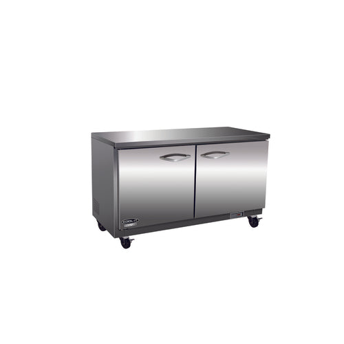 IKON Undercounter Freezer, two-section,7.7 cu. ft. capacity, 36-2/5"W x 29-9/10"D x 35-1/2"H, stainless steel top, (2) solid hinged anti-frost doors, (2) epoxy coated wire shelves, electronic thermostat, 0° to -10°F temperature range, digital LED temperature display, automatic defrost, interior: 304 stainless steel floor, aluminum back wall, ABS side walls & door backs, stainless steel front & sides, 2-1/2" swivel casters (2) braked, rear mounted self-contained refrigeration system, R290 refrigerant, 1/2 HP, 115v/60/1-ph, 7.7 amps, NEMA 5-15P, cETLus, ETL-Sanitation