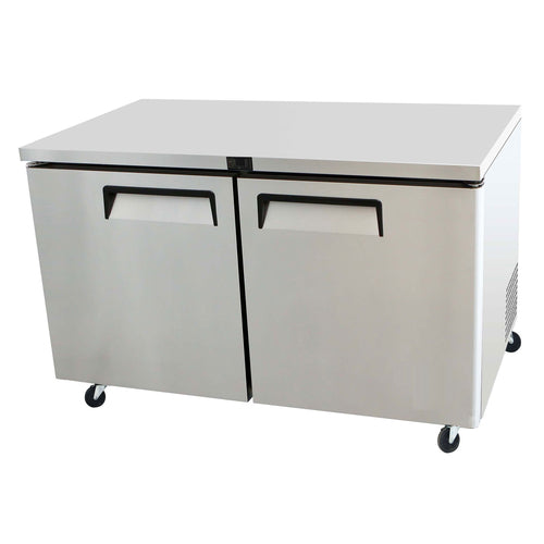 Reach-In Undercounter Freezer, two-section, self-contained, 60.2" W, 17.9 cu. ft. capacity, (2) solid hinged self-closing doors, (4) shelves, -10° to 0°F temperature range, stainless steel top, front, sides, & interior, (4) 4" D casters (2 front locking), rear mounted refrigeration, R404A refrigerant, 1/2 HP, 115v/60/1-ph, 7.2 amps, cETLus, ETL