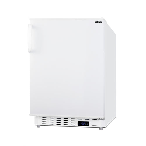 Undercounter All-Freezer, reach-in, built-in or freestanding, ADA compliant, 2.68 cu. ft. capacity, (3) adjustable wire shelves, (3) removable door racks, digital thermostat, -13° to 5°F temperature range, manual defrost, open door & high/low temperature audible alarms, 3" thick reversible right-hand swing white door, white textured cabinet, (2) level legs & (2) wheels, right angle cord, exterior fan, R600a Hydrocarbon refrigerant, 115v/60/1-ph, 0.6 amps, cETLus (Residential)