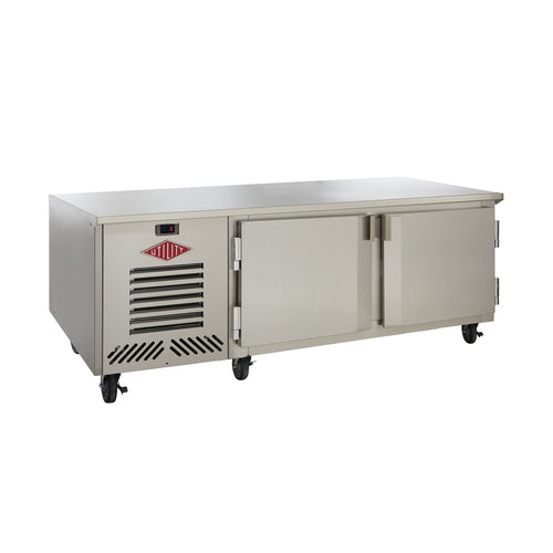 Undercounter Freezer, standard depth, two-section, side-mounted self-contained refrigeration, 68"W x 34-1/2"D x 33-1/2"H, 16.0 cu. ft., digital temperature control, (2) solid stainless steel doors, stainless steel front & sides with stainless steel flat top, 1/2 HP, cETLus, ELT-Sanitation