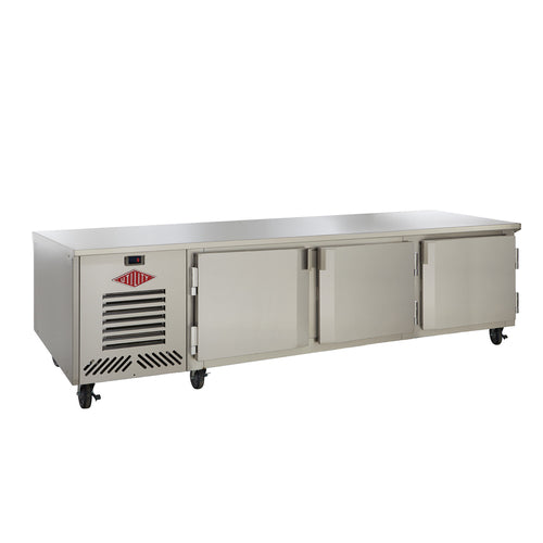 Undercounter Freezer, narrow depth, three-section, side-mounted self-contained refrigeration, 93"W x 28"D x 33-1/2"H, 19.0 cu. ft., digital temperature control, (3) solid stainless steel door, stainless steel front & sides with stainless steel flat top, 1/2 HP, cETLus, ELT-Sanitation (contact factory for price)