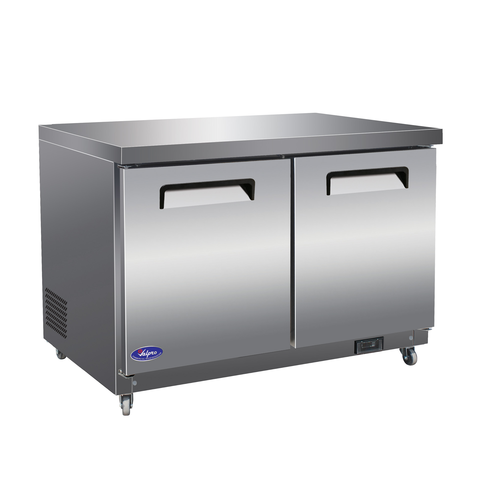 Undercounter Freezer, reach-in, two-section, 12 cu. ft. capacity, rear mount self-contained refrigeration, digital thermostat with LED display, worktop surface, (2) solid hinged self-closing doors, (2) adjustable epoxy coated wire shelves, 430 stainless steel top, front & sides, white ABS interior, 304 stainless steel floor, (4) casters (2) locking, R290 Hydrocarbon refrigerant, cord with NEMA 5-15P, 1/2 HP, 115v/60/1-ph, 2.4 amps, ETL, ETL-Sanitation