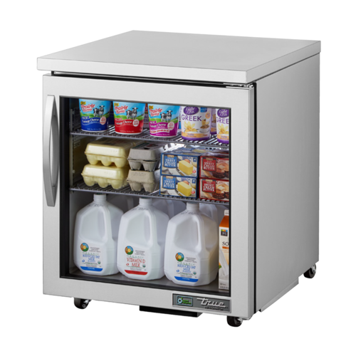 Undercounter Refrigerator, 34" working height, 33 - 38°F, framed glass door version 01, (1) Low-E glass door, (2) PVC coated adjustable wire shelves, LED interior lighting, stainless steel top, front & sides, clear coated aluminum interior with stainless steel floor, 3" castors, R290 Hydrocarbon refrigerant, 1/6 HP, 115v/60/1-ph, 2.0 amps, NEMA 5-15P, cULus, UL EPH Classified, CE, ADA Compliant, Made in USA