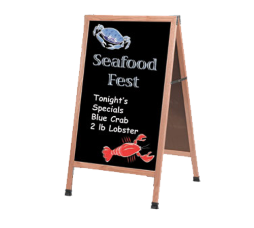 Sidewalk Chalkboard, 24"W x 42"H, black composition board, solid oak A-frame, steel reinforced corners, full length piano hinges & two locking folding hinges, weather resistant hardware, plastic camel foot floor leveler, clear lacquer finish