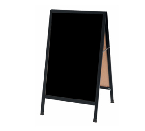 Sidewalk Markerboard, 24"W x 42"H, black melamine board, aluminum A-frame, steel reinforced corners, full length piano hinges & two locking folding hinges, weather resistant hardware, plastic camel foot floor leveler, black powder coated finish