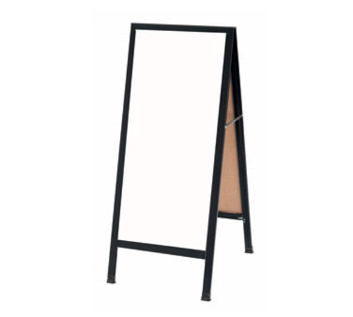 Sidewalk Markerboard, 18"W x 42"H, white porcelain board, aluminum A-frame, steel reinforced corners, full length piano hinges & two locking folding hinges, weather resistant hardware, plastic camel foot floor leveler, black powder coated finish