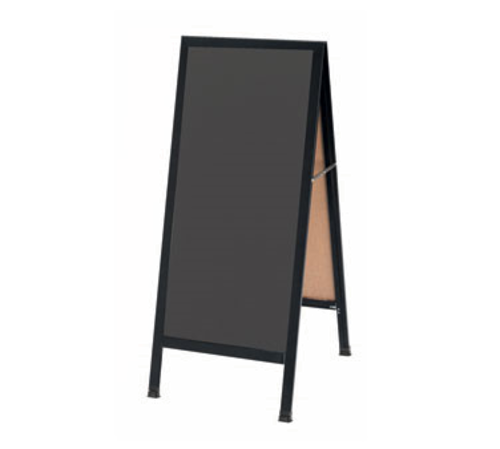 Sidewalk Chalkboard, 18"W x 42"H, slate porcelain board, aluminum A-frame, steel reinforced corners, full length piano hinges & two locking folding hinges, weather resistant hardware, plastic camel foot floor leveler, black powder coated finish