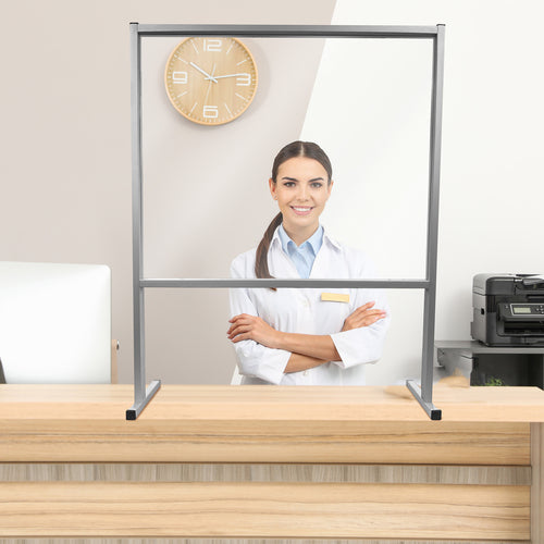Freestanding Protection Shield, counter top, 48" x 24"H, with pass-thru, 1" x 1" thick with pass-thru, heavy-duty aluminum tubing with clear coat finish, rubber feet, acrylic, clear, Made in USA
