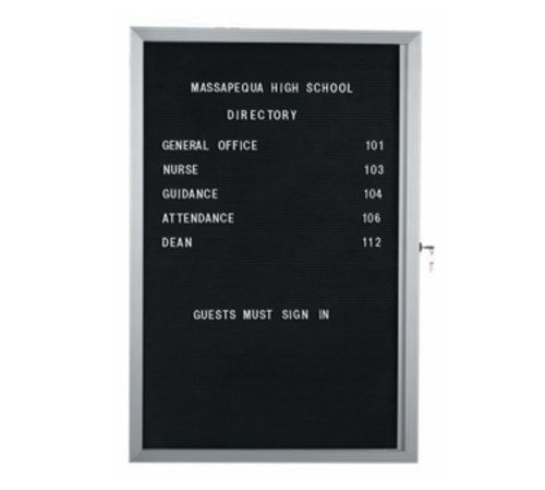 Message Center Board, 18"W x 24"H, hinged face, overlapping clam shell design, black felt panel, aluminum frame, aluminum acrylic door, security lock, includes (1) set of 3/4" Helvetica letters and assortment tray
