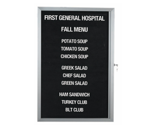 Message Center Board, 24"W x 36"H, hinged face, overlapping clam shell design, black felt panel, aluminum frame, aluminum acrylic door, security lock, includes (1) set of 3/4" Helvetica letters and assortment tray