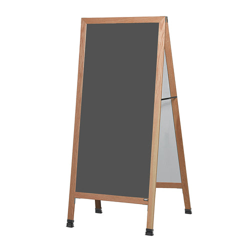 Sidewalk Chalkboard, extra large, 68"W x 30", slate porcelain board, solid oak A-frame, steel reinforced corners, full length aluminum piano hinges & two locking folding hinges, weather resistant hardware, plastic camel foot floor leveler, clear satin anodized finish