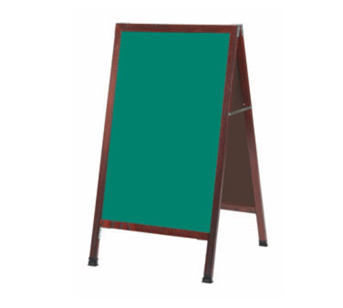 Sidewalk Chalkboard, 24"W x 42"H, green composition board, solid oak A-frame, steel reinforced corners, full length piano hinges & two locking folding hinges, weather resistant hardware, plastic camel foot floor leveler, cherry lacquer finish