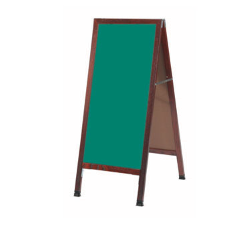 Sidewalk Chalkboard, 18"W x 42"H, green porcelain board, solid oak A-frame, steel reinforced corners, full length piano hinges & two locking folding hinges, weather resistant hardware, plastic camel foot floor leveler, cherry lacquer finish
