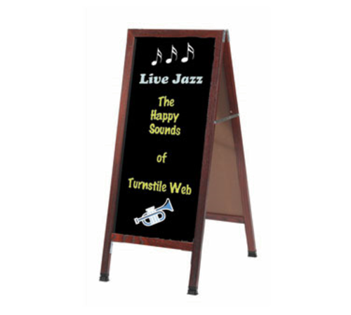 Sidewalk Chalkboard, 18"W x 42"H, black composition board, solid oak A-frame, steel reinforced corners, full length piano hinges & two locking folding hinges, weather resistant hardware, plastic camel foot floor leveler, cherry lacquer finish