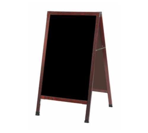 Sidewalk Markerboard, 24"W x 42"H, black porcelain board, solid oak A-frame, steel reinforced corners, full length piano hinges & two locking folding hinges, weather resistant hardware, plastic camel foot floor leveler, cherry lacquer finish