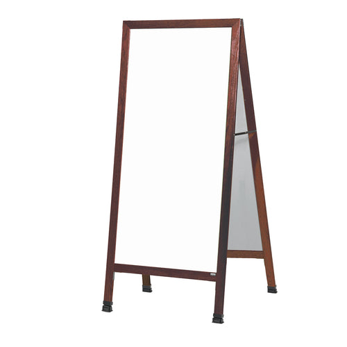 Sidewalk Markerboard, extra large, 68"W x 30", white melamine board, solid oak A-frame, steel reinforced corners, full length aluminum piano hinges & two locking folding hinges, weather resistant hardware, plastic camel foot floor leveler, cherry lacquer finish