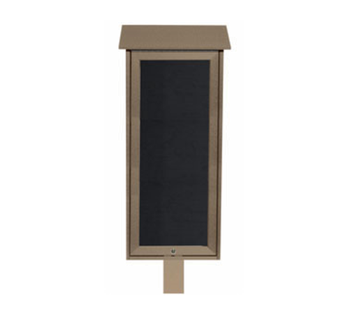 Slimline Message Center, 16"W x 34"H, freestanding, black letter board, plastic lumber frame, (1) door, top hinged, full length piano hinges, lockable, plastic lumber single post, includes: (2) keys, (1) set of 3/4" Helvetica letters and assortment tray, weatherproof, weathered wood (packed in 2 boxes, must be shipped LTL)