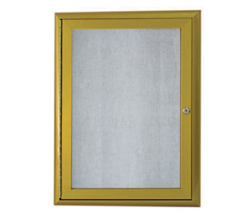 Waterfall Bulletin Board, 18"W x 24"H, enclosed, contemporary design, burlap weave vinyl surface, aluminum frame, clear acrylic safety glass, full length hinges, lockable, concealed mounting brackets, indoor/outdoor use, antique brass finish