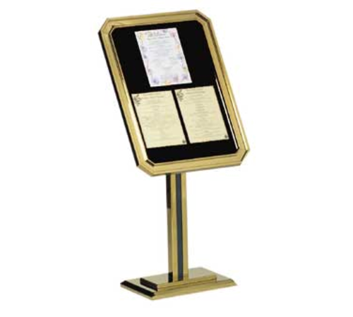 Sign/Poster Stand, 18-1/2"W x 26-1/2"H frame (23" x 49" OA), ornamental design, removable rear panel, acrylic cover, heavy duty welded construction, polished brass finish